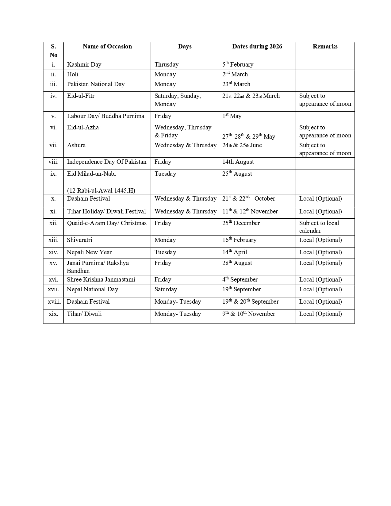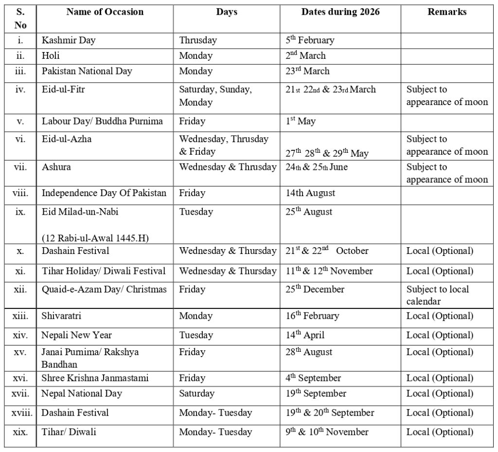 The following holidays shall be observed and the Embassy of Pakistan, Kathmandu will remain closed on these days/ dates as mentioned below:-